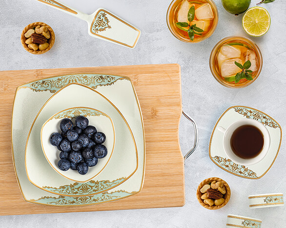 این سرویس چینی در دو طیف فیروزه ای و متداخل تولید شده است.