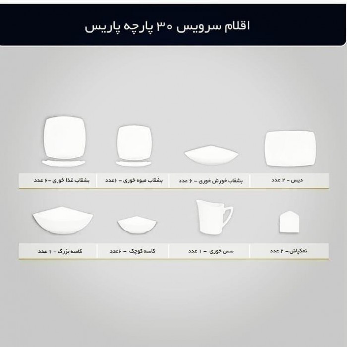 هر کدام از طیف های تولیدی این محصول شامل دو سایز سرویس شش نفره (30 پارچه) و سرویس دوازده نفره (105 پارچه) می باشد.