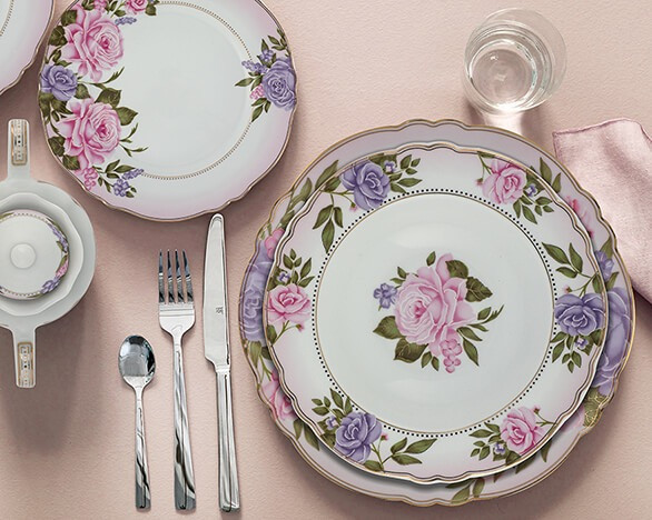 سرویس چینی الگانس طرح آنیل این محصول دارای قالب کلاسیک با طرحی مدرن است رنگ های یاسی و صورتی ملایم استفاده شده در این ظروف چینی نماد آرامش و محبت هستند .