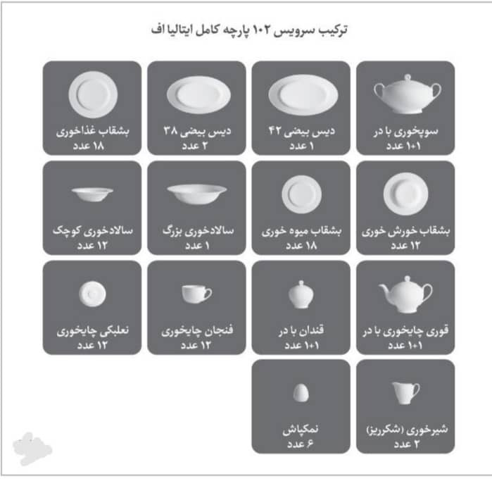 سرویس های 12نفره زرین سری ایتالیا اف 102پارچه است و این مزیت رو داره که تعداد پلوخوری و پیش دستی آن 18عدد است به جای 12عدد.