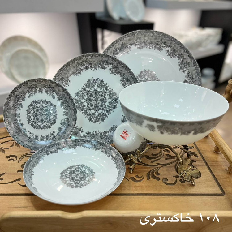 سرویس ۲۶ پارچه گرد کلاسیک مقصود طرح ۱۰۸ خاکستری برند دینو